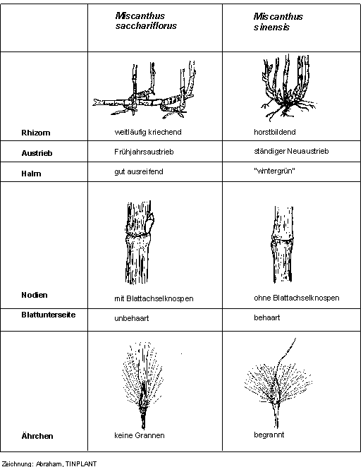 Die nachfolgende Abbildung zeigt wesentliche Unterscheidungsmerkmale zwischen den Arten Miscanthus sacchariflorus und Miscanthus sinensis